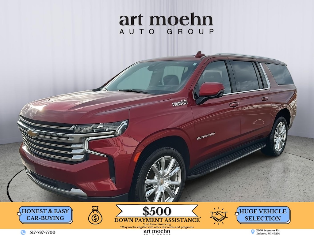 This 2022 Chevrolet Suburban High Country, has a Cherry Red Tintcoat exterior and a Jet Black/Mocha interior color. 122,071 miles. Stock Number 73661A. You can connect with us by calling 517-787-7700. IMPORTANT PACKAGE INFORMATION:Preferred Equipment Group 3LZ