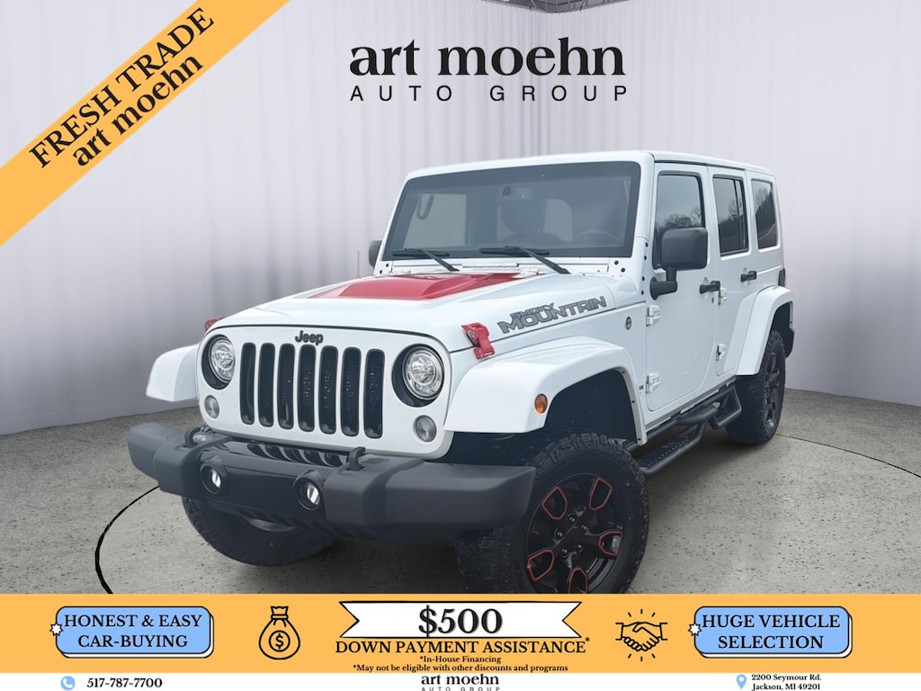 This 2017 Jeep Wrangler Unlimited Smoky Mountain, has a Bright White exterior and a Black interior color. 90,780 miles. Stock Number 73990B. You can connect with us by calling 517-787-7700. IMPORTANT PACKAGE INFORMATION: Quick Order Package 23Y Smoky Mountain ($3,900 value)Leather-Faced SeatsSmoky Mountain EditionDriver Height Adjuster SeatBlack Accent StitchingFront Heated SeatsGlossy Black Jeep BadgeGloss Black Fascia AppliqueBody Colour Grille with Black AccentsDelete Sahara BadgeHood with Power BulgeMillennium Fabric Sport Bar CoverSmoky Mountain Hood DecalsMOPAR Black Taillamp GuardsBody-Colour Freedom Top HardtopLow-Gloss Black Wrangler Decal18" X 7.5" High-Gloss Black Polished WheelsMOPAR Coat Hooks and Grab HandlesA/C RefrigerantBlack Fuel-Filler DoorMidnight Star Interior AccentsQuick Order Package 24Y Smoky Mountain ($3,900 value)Leather-Faced SeatsSmoky Mountain EditionDriver Height Adjuster SeatBlack Accent StitchingFront Heated SeatsGlossy Black Jeep BadgeGloss Black Fascia AppliqueBody Colour Grille with Black AccentsDelete Sahara BadgeHood with Power BulgeMillennium Fabric Sport Bar CoverSmoky Mountain Hood DecalsMOPAR Black Taillamp GuardsBody-Colour Freedom Top HardtopLow-Gloss Black Wrangler Decal18" X 7.5" High-Gloss Black Polished WheelsMOPAR Coat Hooks and Grab HandlesA/C RefrigerantBlack Fuel-Filler DoorMidnight Star Interior AccentsConnectivity Group ($525 value)Electronic Vehicle Information CentreHands-Free Communication with BluetoothTire Pressure Monitoring SystemDual Top Group ($1,420 value)Black Sunrider Soft TopTrailer Tow Group ($500 value)Class II Hitch Receiver4-Pin Wiring HarnessLED Lighting Group ($495 value)LED Fog LampsLED Reflector Headlamps Comfort Heated seats offer cool weather comfort by warming the seat quickly, before the air in the passenger compartment is fully warmed by the heater.Convenience The keyfob has the ability to remotely start the vehicle's engine.Exterior and Appearance A sunroof is located above the first row of seating.Technology and Telematics The vehicle is equipped with built-in navigation system. Otherwise known as Bluetooth, this technology allows electronic devices to integrate with the vehicle systems without the need for a physical connection between them. If you decide to speak with one of our knowledgeable associates - please reference this Stock number 73990B. Connect with us now by calling 517-787-7700. This Jeep has gone through our service process - You can request the full inspection at anytime. HONEST & EASY CAR BUYING Buying a vehicle can be a stressful experience, and we understand that. That's why we've built our business on earning your trust, and to make you feel financially protected. Through our trusted car-buying process, you'll have access to full service reports and vehicle history checks. Furthermore, we are a KBB brand top-rated dealer. A Cargurus 4-1/2 star dealer, and we have over 1,000 Google reviews! Choose Art Moehn Auto Group today, and come see how easy buying a car can be.