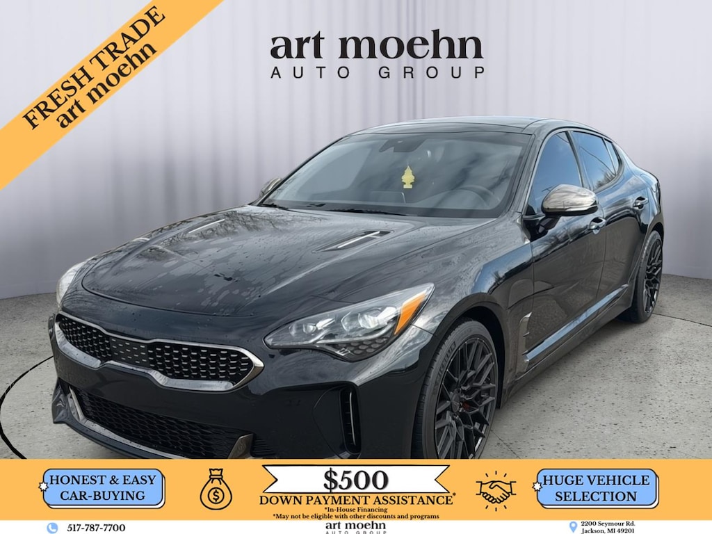 2021 Kia Stinger GT1, has a Aurora Black exterior and a Black interior color. 77,223 miles. Stock Number A2242B. You can connect with us by calling 517-787-7700.