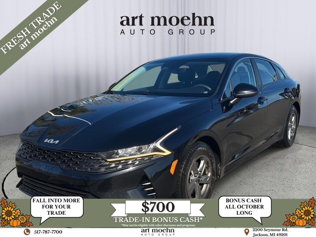 2023 Kia K5 LXS, has a Ebony Black exterior and a Black interior color. 77,494 miles. Stock Number A2139A. You can connect with us by calling 517-787-7700.